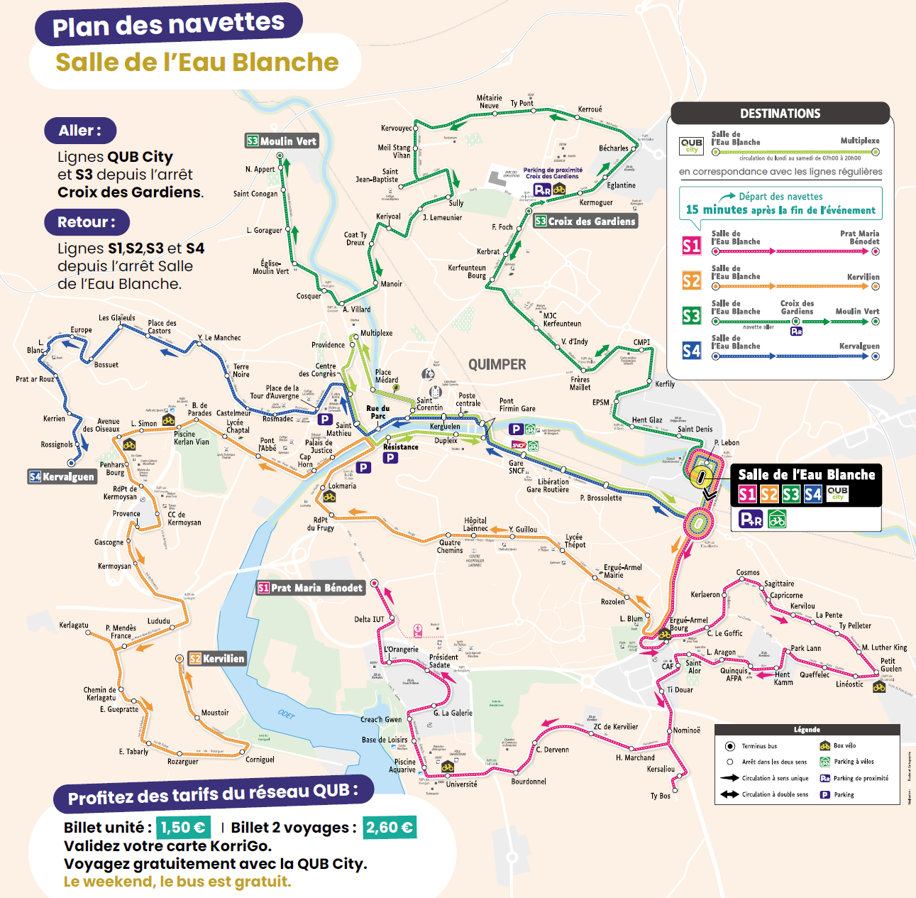 QUB City : Navette gratuite du centre-ville, avec un passage toutes les 10 à 15 minutes à l’arrêt Résistance, direction la Grande Salle de l’Eau Blanche, jusqu’à 20h00. Correspondances possibles avec les lignes régulières à Résistance.